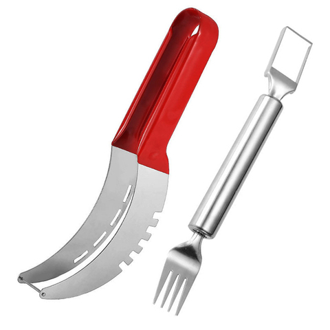 2-in-1 스테인레스 스틸 과일 커터 주방 도구 스테인레스 커터 수박 포크 슬라이서 커터 및 과일 슬라이서